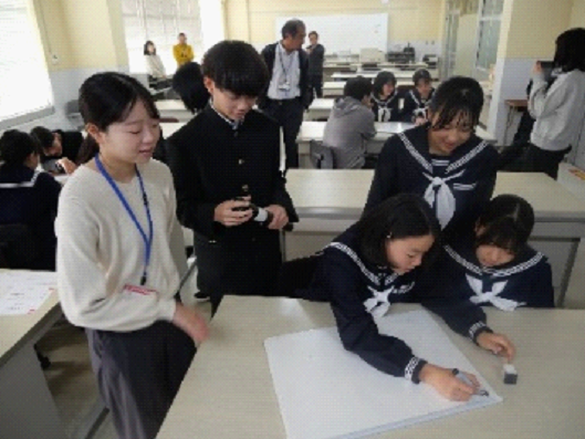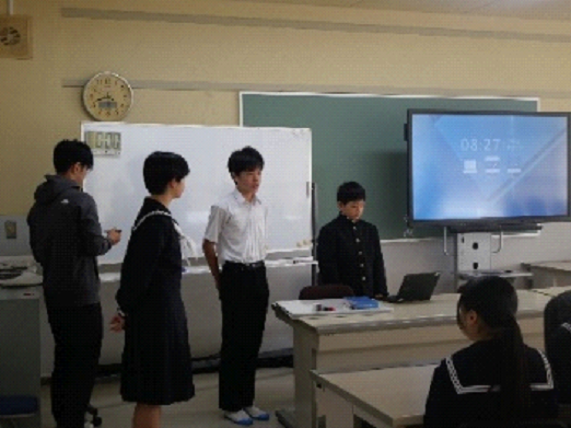 また、生徒会からは、相手や場に応じた言葉遣いや、授業中の気になる行動など、生徒会の役員が演じて動画を撮ってくれ、より良い学校生活についての提案をしてくれました。動画を見ながら、心当たりがあるのか、お互いの顔を見合す場面も。少し、意識をしていくこと、また、気づいたときのお互いの優しい声掛けがあると良いですね。