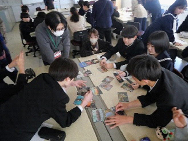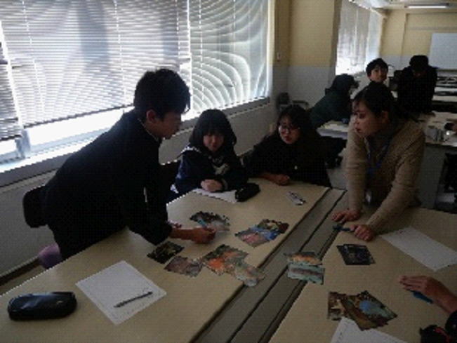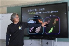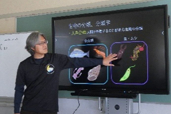 1月22日、黒潮生物研究所の古井戸さんをお招きし、講話をしていただきました。この講話は、今年で3年目になります。古井戸さんは、黒潮流域の生物、特にサンゴの研究をされています。今年は生物の「分類」について、教えていただきました。内容としてはかなり難しかったのですが、説明やヒントをいただきながら、カードに写された生物を、グループで話し合いをしながら、分類していくことができました。同じ仲間だと思っていた生物が、実は違う生物の仲間だということに気付くなど、面白い発見があった一時間でした。