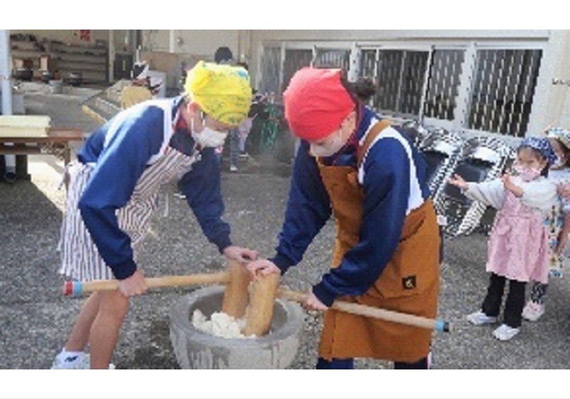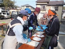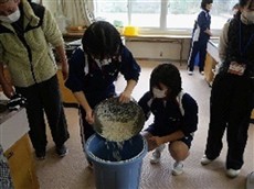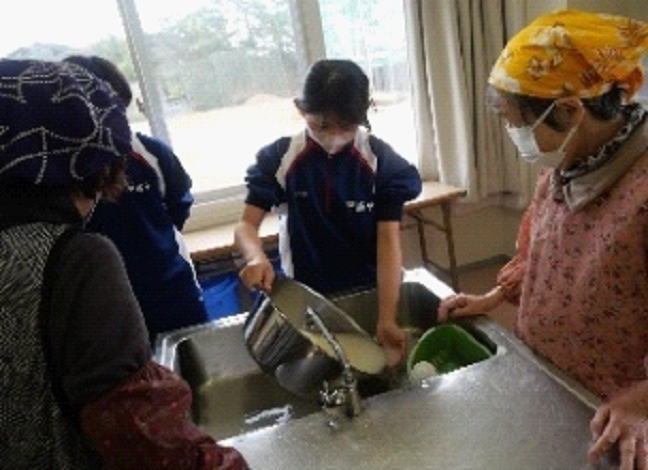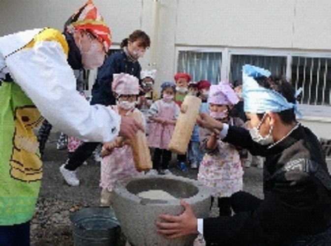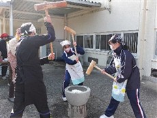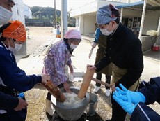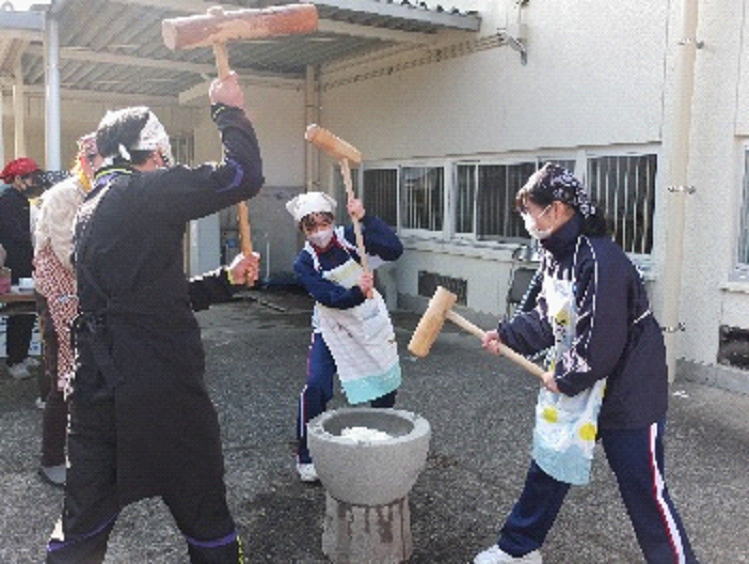 1月27日、恒例のもちつき交流会を行いました。今年も婦人会の方々に協力していただき、にぎやかにもちつきを行うことができました。この日のために、前日の6時間目に公民館の調理室で、1年生が婦人会の方にもち米の洗米の手ほどきを受けながら、せっせと大量のもち米を研ぎ、水に浸しておく作業をしてくれました。