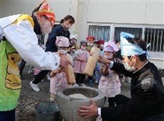 当日は快晴!風もあまりなく、寒さも前日より和らいで、外での活動もしやすい状況でした。餅つきは最初のこねる作業が肝心。3年生のこね方がうまく、おかげで、つく作業がスムーズに行えました。やさしく園児のサポートもできていました。2年生は自分たちの分担の片付けが終わっても、全体を見て他を手伝うなど、次期リーダーとしてとても頼もしく思いました。